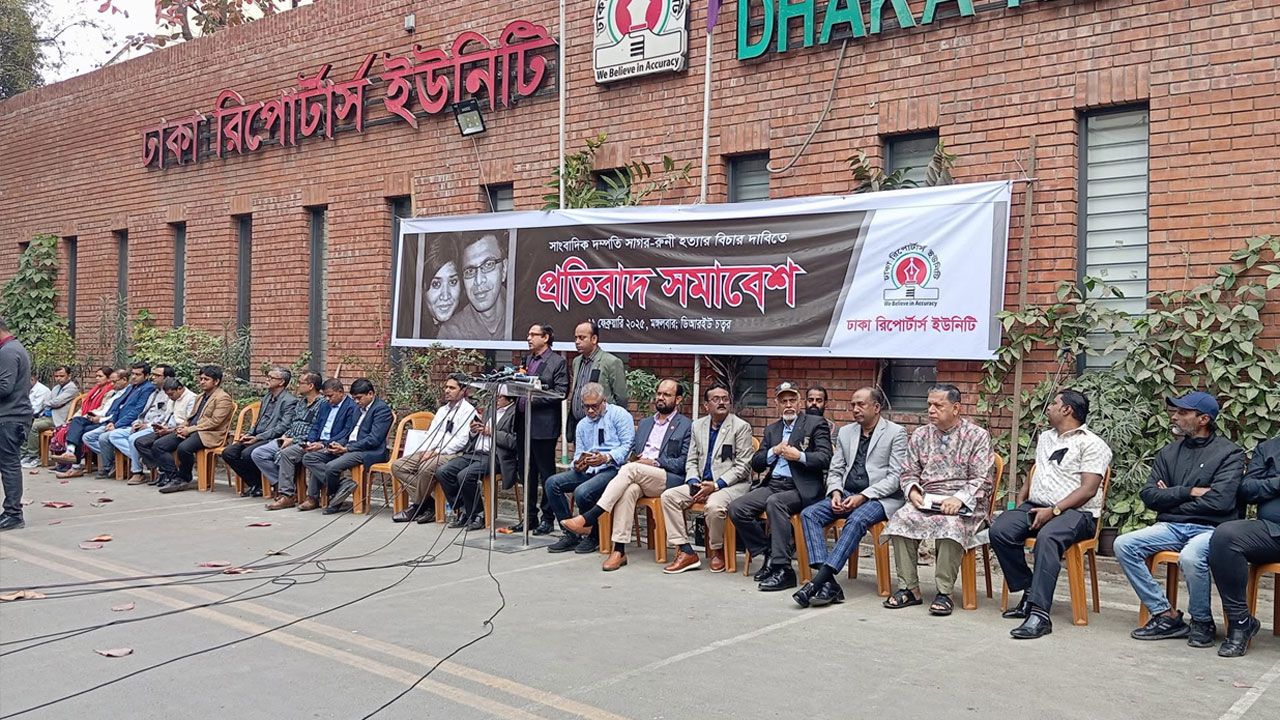 সাংবাদিক দম্পতি সাগর সরওয়ার ও মেহেরুন রুনি হত্যার বিচার দাবিতে প্রতিবাদ সমাবেশ করছেন সাংবাদিকরা।