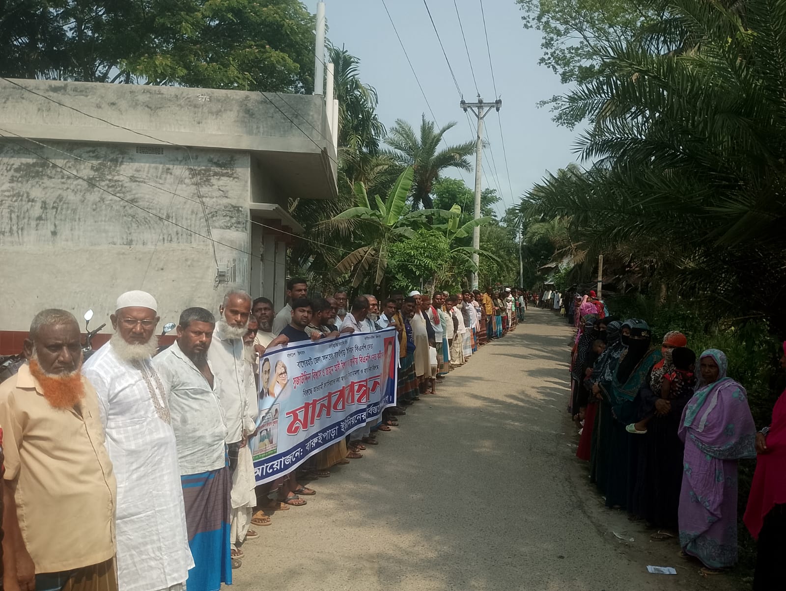 সোমবার (২০ এপ্রিল) সকালে বারুইপাড়া এলাকার কার্তিক দিয়া মাধ্যমিক বিদ্যালয়ের সামনে প্রায় এক ঘণ্টাব্যাপী এ মানববন্ধন অনুষ্ঠিত হয়। বারুইপাড়া ইউনিয়নবাসীর আয়োজনে কর্মসূচিতে বিভিন্ন শ্রেণি-পেশার বিপুলসংখ্যক মানুষ অংশ নেন।